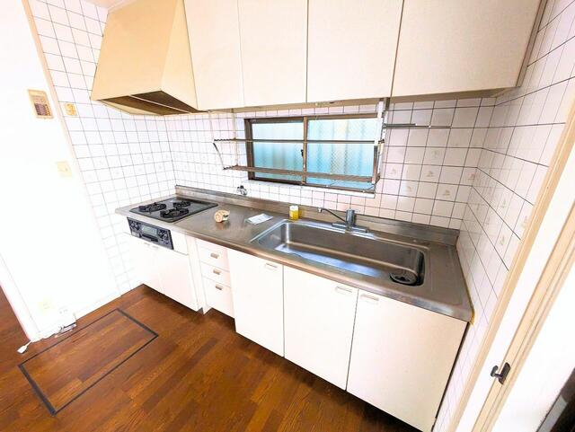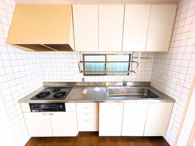 収納力のある吊戸棚と、シンク・調理スペースが特徴のキッチン。