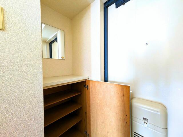 玄関のシューズボックスはミラー付き。外出前の身だしなみチェッ