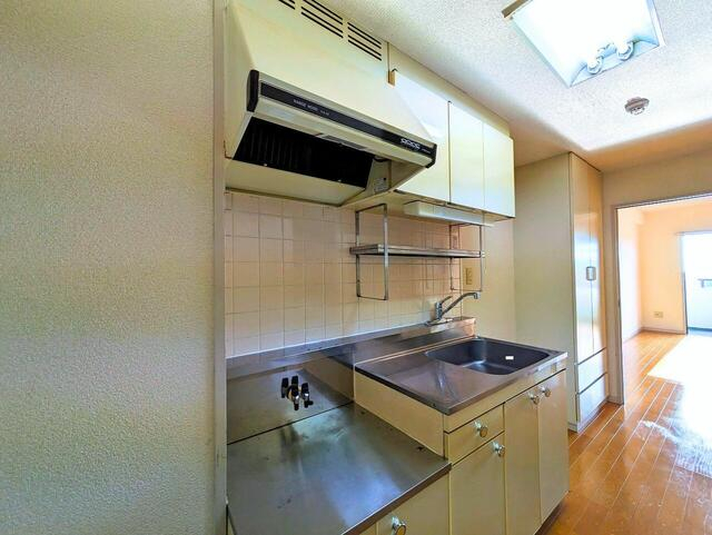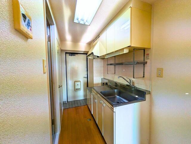 廊下型のキッチンは吊戸棚&ラック付きで、調理道具をまとめて収