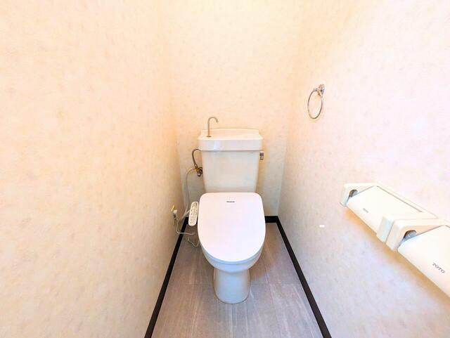 温水洗浄便座付きトイレ。手洗い一体型タンクで使い勝手に配慮。