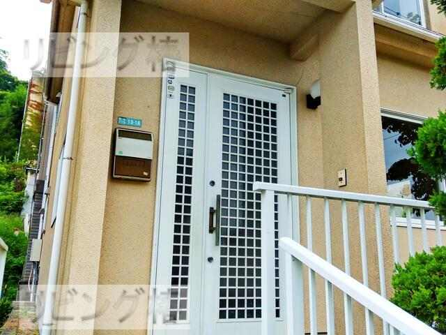 ツーロック鍵の白い扉の玄関です。玄関前には大きな木がありある