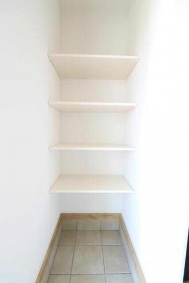 【施工例】玄関には土間収納が付いています。可動式の棚付きで、