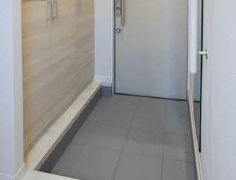 シューズボックス、全身ミラー、手すりのある玄関です