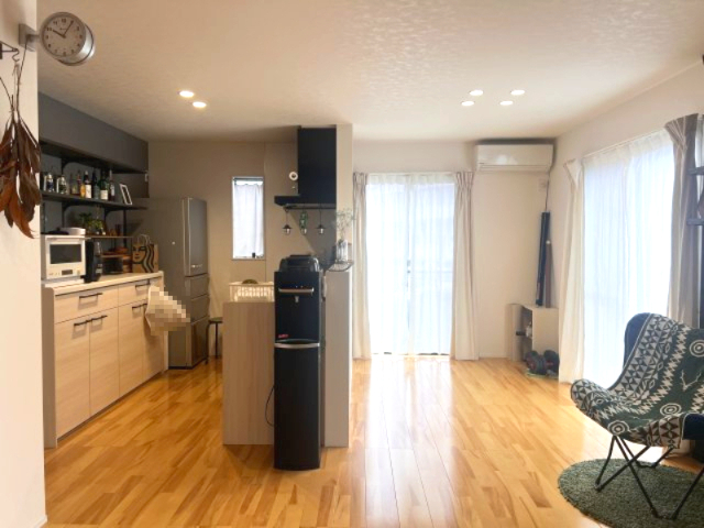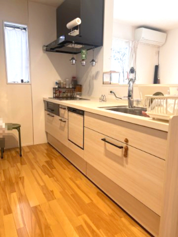 システムキッチンには背面収納あり。対面キッチンです。
