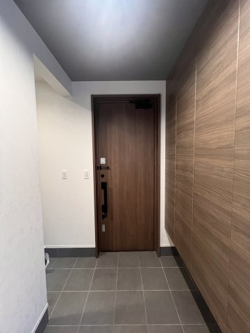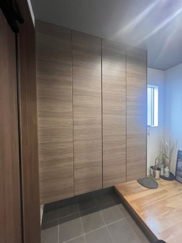 木目調の玄関ドアと、タイル貼りのポーチ。左側には土間収納有。