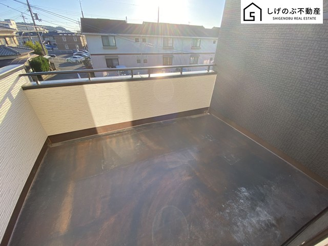 青い空が広がる開放的なバルコニー。日差しを遮るものがないので、育ち盛りのお子様のお洗濯ものが多くてもたっぷり気持ちよくお洗濯して頂けます。