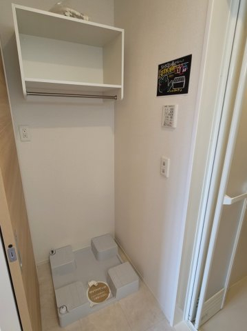 室内洗濯機置き場です。上部に棚もあって洗剤などもストックしておけますね。