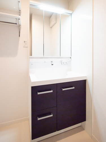 三面鏡シャワー付き洗面台です。横は室内洗濯機置き場です。稼働棚もあって便利。