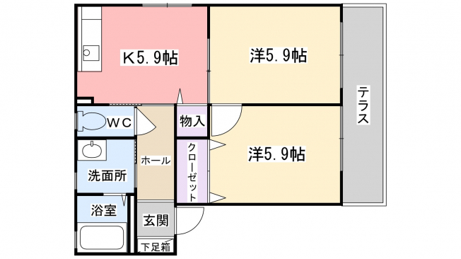 5.9帖のキッチンです。半透明のスライディングドアなので明るいです。