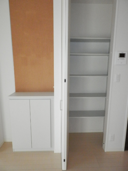 リビング収納。tel台とコルクボードがありますのでメモをピンで刺しておくことなんかも出来ますよ!