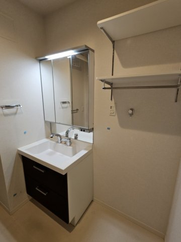 三面鏡シャワー付き洗面台。洗濯機置き場には稼働棚があって便利です