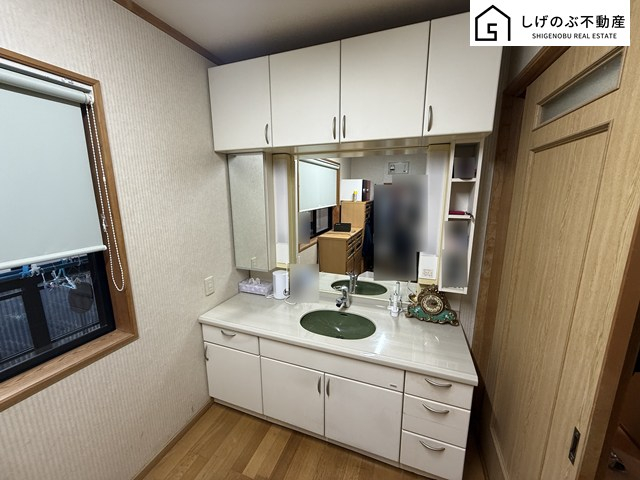 大きな鏡付きの洗面台で毎日の身だしなみもばっちりですね。
