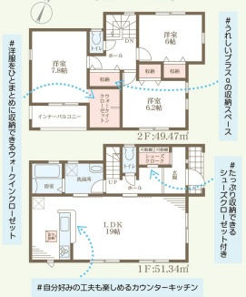 担当者のコメント:洋服をひとまとめに収納できるウォークインクローゼット。うれしいプラスαの収納スペース。自分好みの工夫も楽しめるカウンターキッチン。