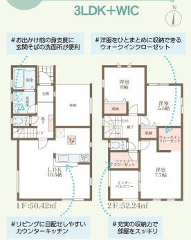 担当者のコメント:お出かけ前の身支度に便利な玄関そばの洗面所付き。リビングから家族の様子を確認しやすい間取りです。充実の収納力で片付けもスッキリ。