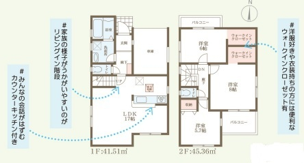 担当者のコメント:家族の様子が確認しやすいリビングイン階段付き。みんなの会話が弾むカウンターキッチン採用。各階にウォークインクロゼットがあり衣類収納も充実。