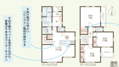 担当者のコメント:抜け感のある心地よいリビングイン階段が特徴的な物件です。ウォークインクロゼット付きで収納力もバッチリ。ペットや家族を見守りながら家事ができるカウンターキッチン。