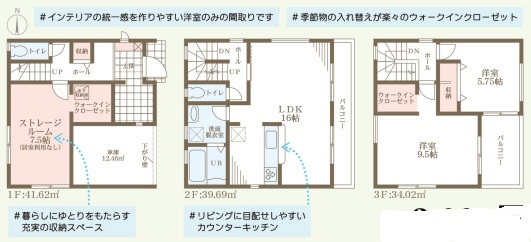 担当者のコメント:統一感あるインテリアが楽しめる洋室のみの間取りです。季節物もスッキリ収まるウォークインクローゼット付き。カウンターキッチンからリビングを見渡せる安心の3階建て。