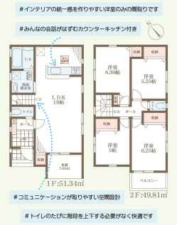 担当者のコメント:洋室のみで構成されたインテリアの統一感を作りやすい間取りです。リビングにはカウンターキッチンを設け、家族の会話が弾む空間設計。コミュニケーションが取りやすいリビング設計。1階にもトイレがあり、階段の上り下りが不要で快適です。