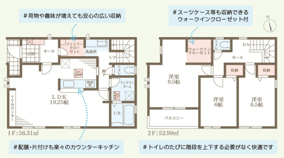 担当者のコメント:荷物や趣味が増えても安心の広い収納スペース付き。スーツケース等も収納できるウォークインクローゼット完備。配膳・片付けも楽々のカウンターキッチン。2階にもトイレがあり快適な生活動線です。
