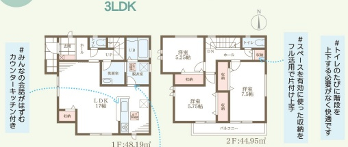 担当者のコメント:みんなの会話がはずむカウンターキッチン付き。忙しい朝のマルチタスクにもうれしい効率的な動線設計。スペースを上手に活用したコンパクトで暮らしやすい間取りです。