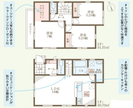担当者のコメント:スーツケースなど大きな荷物も収納できるウォークインクローゼット付き。家族が自然と集まるコミュニケーション重視の間取りです。2階にもトイレがあるため、深夜に階段を使う必要がありません。