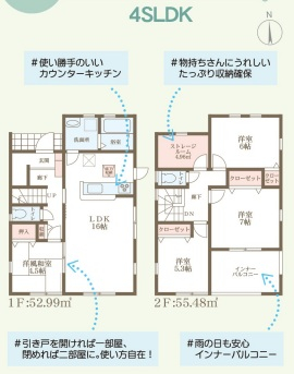 担当者のコメント:使い勝手のいいカウンターキッチン採用。物持ちさんにも嬉しいたっぷり収納確保。引き戸を開ければ一部屋・閉めれば二部屋に使える多目的空間。雨の日も安心のインナーバルコニー完備。
