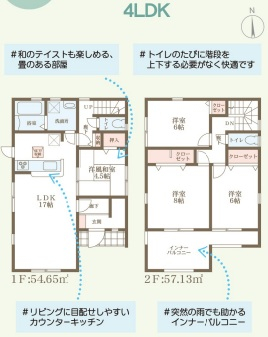 担当者のコメント:和のテイストも楽しめる畳のある部屋が魅力。トイレが各階に配置されているので階段を上下する必要がなく快適。リビングに目配せしやすいカウンターキッチン採用。突然の雨でも助かるインナーバルコニー完備。