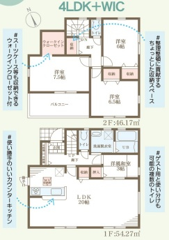 担当者のコメント:スーツケース等も収納できるウォークインクローゼット付き。整理整頓に貢献するちょっとした収納スペースが便利。使い勝手のいいカウンターキッチン採用。ゲスト用と使い分けもできる複数のトイレが魅力。