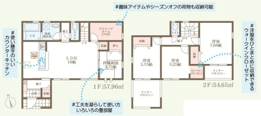 担当者のコメント:趣味アイテムやシーズンオフの荷物もたっぷり収納可能。使い勝手のいいカウンターキッチン採用。工夫を凝らせば様々な使い方ができる客間。洋服をひとまとめに収納できるウォークインクローゼット付き。