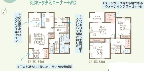 担当者のコメント:スーツケース等も収納できるウォークインクローゼット付き。使い勝手の良いカウンターキッチンです。スッキリした玄関で収納も充実可能です。工夫を凝らして使い方いろいろの畳部屋があります。