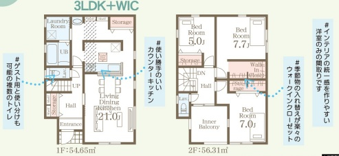 担当者のコメント:ゲスト用と使い分けも可能な複数のトイレがあり、使い勝手のいいカウンターキッチンも魅力です。季節物の入れ替えが楽々のウォークインクローゼットも備え、インテリアの統一感を作りやすい洋室のみの間取りです。