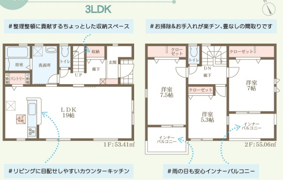 担当者のコメント:リビングに目配せしやすいカウンターキッチンを採用しています。整理整頓に貢献するちょっとした収納スペースがあります。雨の日も安心のインナーバルコニー付きです。お掃除やお手入れが楽チンな畳なしの間取りです。