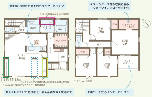 担当者のコメント:家事ラク回遊動線の家KuRuRiで家中がつながる快適な暮らし。専用の造作家具追加で生活に彩りを。配膳・片付けも楽々のカウンターキッチン。スーツケース等も収納できるウォークインクローゼット付。トイレのたびに階段を上下する必要がなく快適です。雨の日も安心インナーバルコニー。