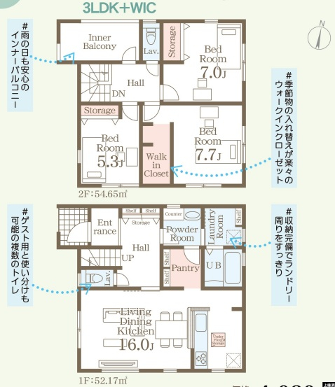 担当者のコメント:雨の日も安心のインナーバルコニーがあり、季節物の入れ替えが楽々のウォークインクローゼットを備えています。収納完備でランドリー周りをすっきり整理でき、ゲスト用と使い分けも可能な複数のトイレがあります。
