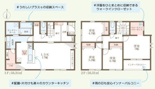 担当者のコメント:うれしいプラスαの収納スペースがあります。洋服をひとまとめに収納できるウォークインクローゼット付きです。配膳・片付けも楽々のカウンターキッチンを採用しています。雨の日も安心のインナーバルコニーがあります。
