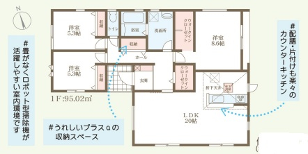 担当者のコメント:畳がなくロボット型掃除機が活躍しやすい室内環境です。配膳・片付けも楽々のカウンターキッチンで、洋服好きや衣装持ちの方には便利なウォークインクローゼット有り。うれしいプラスαの収納スペースもあります。