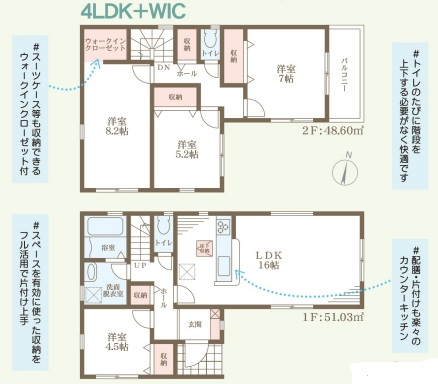 担当者のコメント:スーツケース等も収納できるウォークインクローゼット付きです。上下するのに階段を昇り降りする必要がなく快適です。配膳も片付けも楽々のカウンターキッチンです。フルスペースを有効に使った収納で片付け上手です。