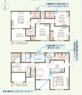 担当者のコメント:敷地60坪以上の回遊性プランです。季節物の入れ替えが楽々のウォークインクローゼットが2箇所あり、収納充実でランドリースペースも確保されています。コミュニケーションが取りやすい玄関設計で、使い勝手の良いカウンターキッチンを採用しています。