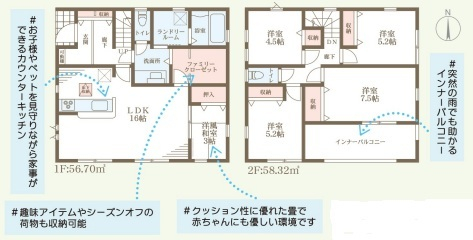 担当者のコメント:おやつベットを見守りながら家事ができるカウンターキッチン。突然の雨でも助かるインナーバルコニー。趣味アイテムやシーズンオフの荷物も収納可能。クッション性に優れた畳で赤ちゃんにも優しい環境です。