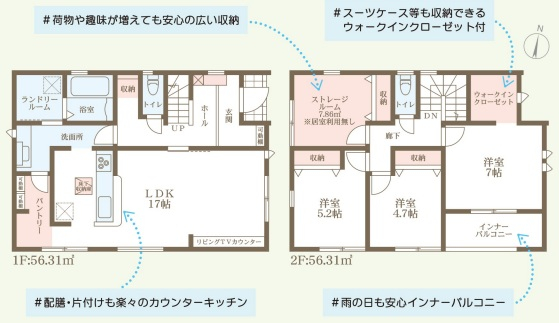 担当者のコメント:荷物や趣味が増えても安心の広い収納があります。スーツケース等も収納できるウォークインクローゼット付きです。配膳や片付けも楽々のカウンターキッチンを採用しています。雨の日も安心のインナーバルコニーがあります。