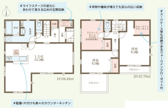 担当者のコメント:ライフステージの変化にあわせて使える広めの玄関収納があります。荷物や趣味が増えても安心の広い収納を備えています。スーツケース等も収納できるウォークインクローゼット付です。配膳・片付けも楽々のカウンターキッチンで家事がはかどります。