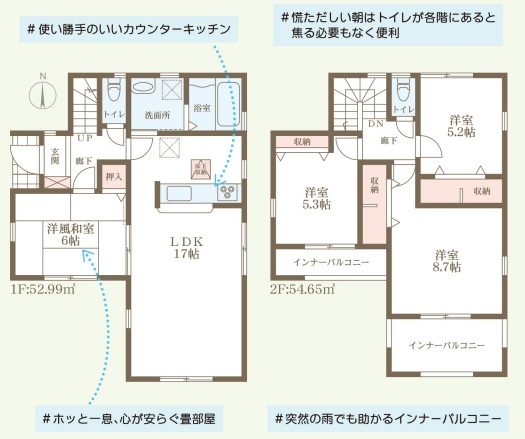 担当者のコメント:使い勝手のいいカウンターキッチンです。慌ただしい朝はトイレが各階にあると焦る必要もなく便利です。ホッと一息、心が安らぐ畳部屋があります。突然の雨でも助かるインナーバルコニー付きです。