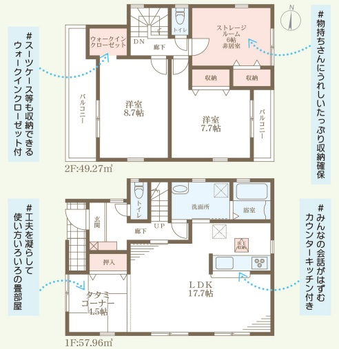 担当者のコメント:スーツケース等も収納できるウォークインクローゼット付きです。物持ちさんにうれしいたっぷり収納確保しています。工夫を凝らして使い方いろいろの畳部屋があります。みんなの会話がはずむカウンターキッチン付きです。