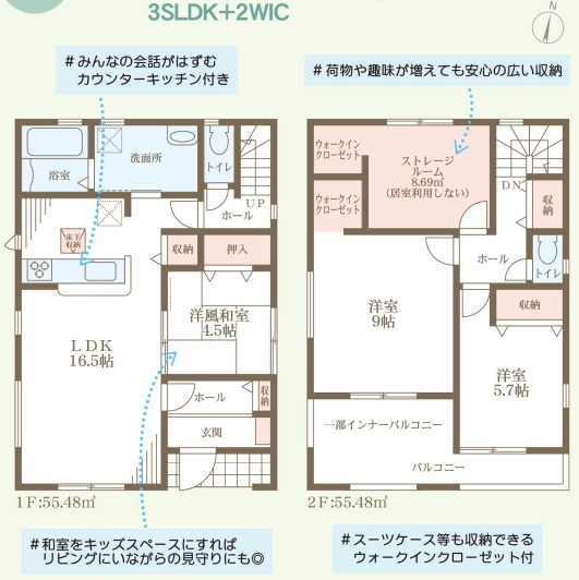 担当者のコメント:みんなの会話がはずむカウンターキッチン付きです。和室をキッズスペースにすればリビングにいながらの見守りにも最適です。荷物や趣味が増えても安心の広い収納があり、スーツケース等も収納できるウォークインクローゼット付です。