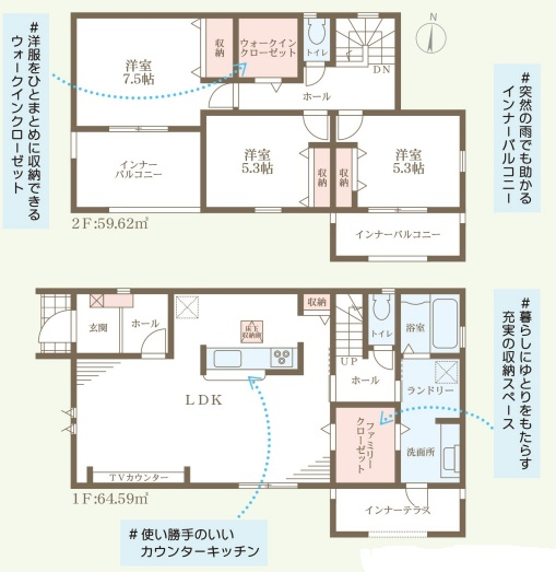 担当者のコメント:突然の雨でも助かるインナーバルコニーがあります。暮らしにゆとりをもたらす充実の収納スペースを備えています。使い勝手のいいカウンターキッチンが魅力です。