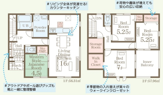 担当者のコメント:リビング全体が見渡せるカウンターキッチンで、荷物や趣味が増えても安心の広い収納があります。アウトドアやボール遊びグッズも靴と一緒に整理整頓でき、季節物の入れ替えが楽々のウォークインクローゼットも完備しています。