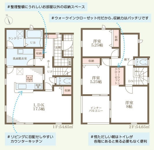 担当者のコメント:整理整頓にうれしいお部屋以外の収納スペースがあります。ウォークインクローゼット付だから収納力はバッチリです。リビングに目配せしやすいカウンターキッチンで安心です。慌ただしい朝はトイレが各階にあると焦る必要もなく便利です。