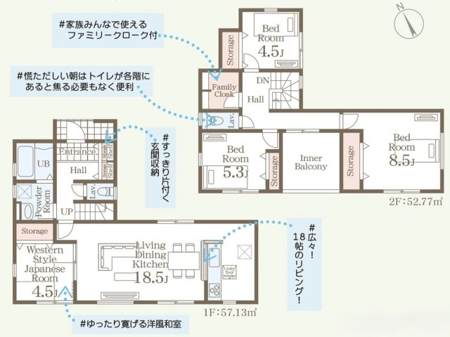 担当者のコメント:家族みんなで使えるファミリークロークが付いています。慌ただしい朝はトイレが各階にあると焦る必要もなく便利です。すっきり納まる収納付きです。ゆったり寛げる洋風和室があります。18畳の広々リビングです。