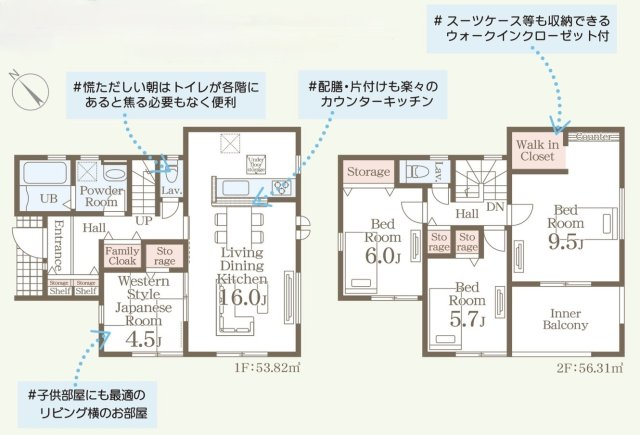担当者のコメント:慌ただしい朝もトイレが各階にあると焦る必要もなく便利です。配膳・片付けも楽々のカウンターキッチンを採用しています。スーツケース等も収納できるウォークインクローゼット付きです。