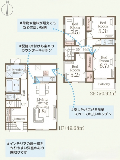 担当者のコメント:インテリアの統一感を作りやすい洋室のみの間取りです。荷物や趣味が増えても安心の広い収納があります。配膳・片付けも楽々のカウンターキッチンを採用しています。